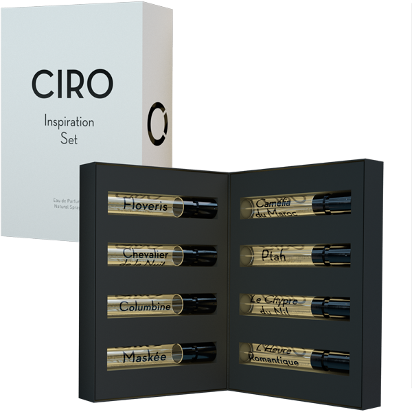 Exklusives CIRO INSPIRATION SET in hochwertiger Design-Klappschachtel mit Manschette. Das Set enthält 2ml-Duftproben aller CIRO Eau de Parfums in exquisiten Mini-Glasphiolen mit schwarzen Zerstäubern. Für den schnellen und unkomplizierten Gebrauch oder einfach nur zum Testen der außergewöhnlichen CIRO-Parfüms.
