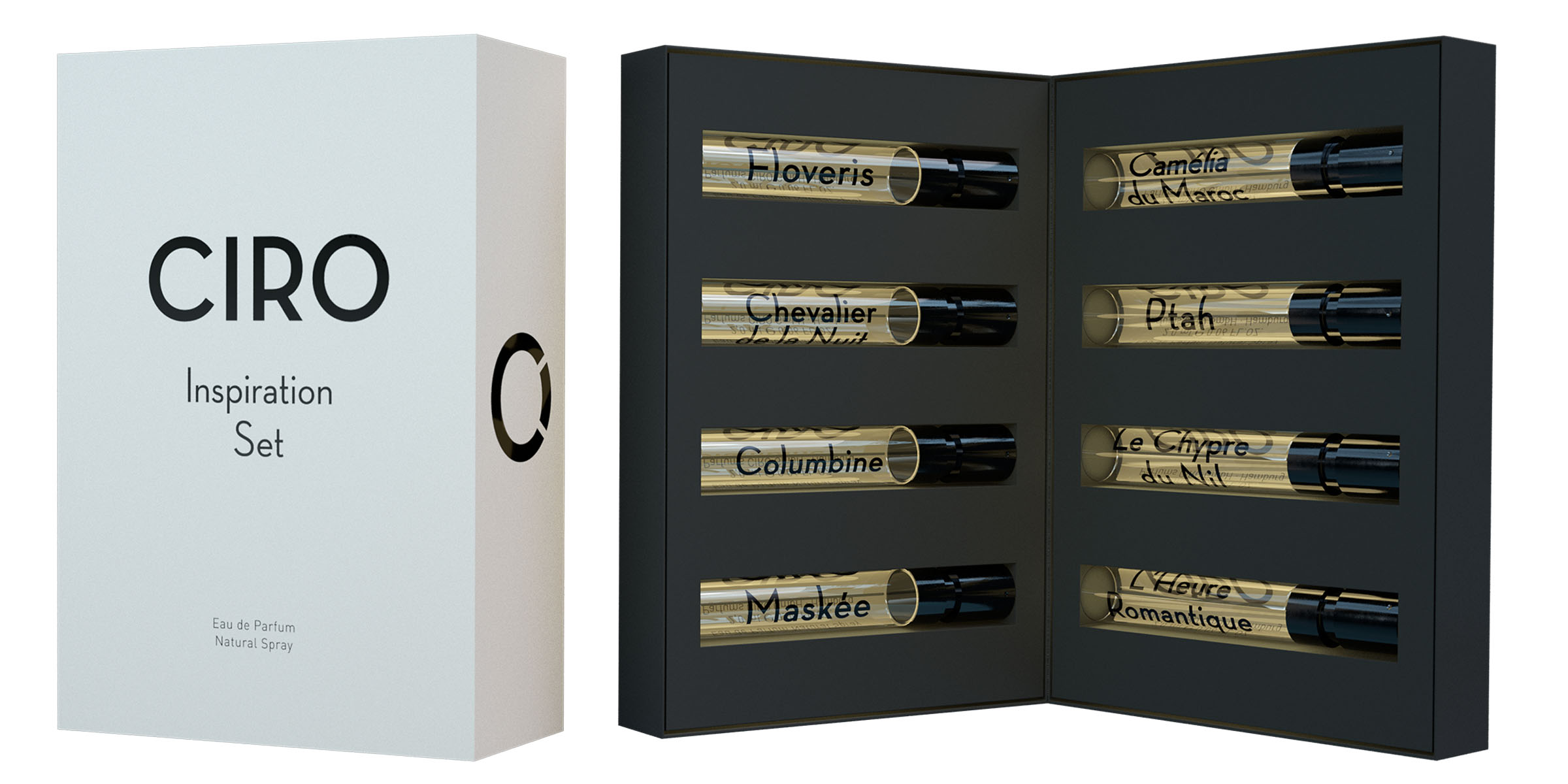 Exklusives CIRO INSPIRATION SET in hochwertiger Design-Klappschachtel mit Manschette. Das Set enthält 2ml-Duftproben aller CIRO Eau de Parfums in exquisiten Mini-Glasphiolen mit schwarzen Zerstäubern. Für den schnellen und unkomplizierten Gebrauch oder einfach nur zum Testen der außergewöhnlichen CIRO-Parfüms.